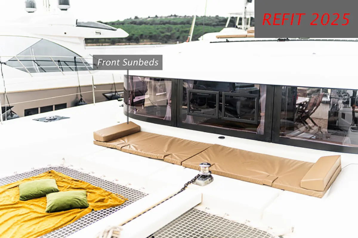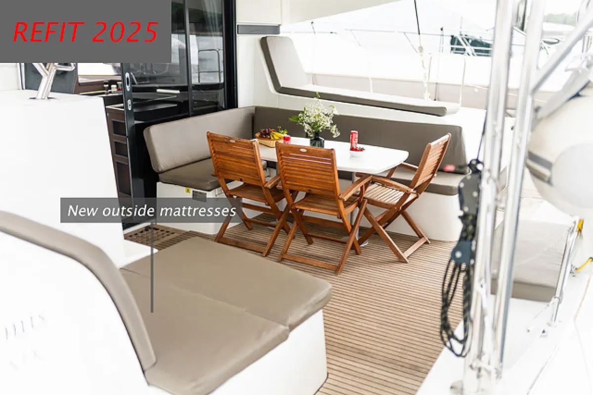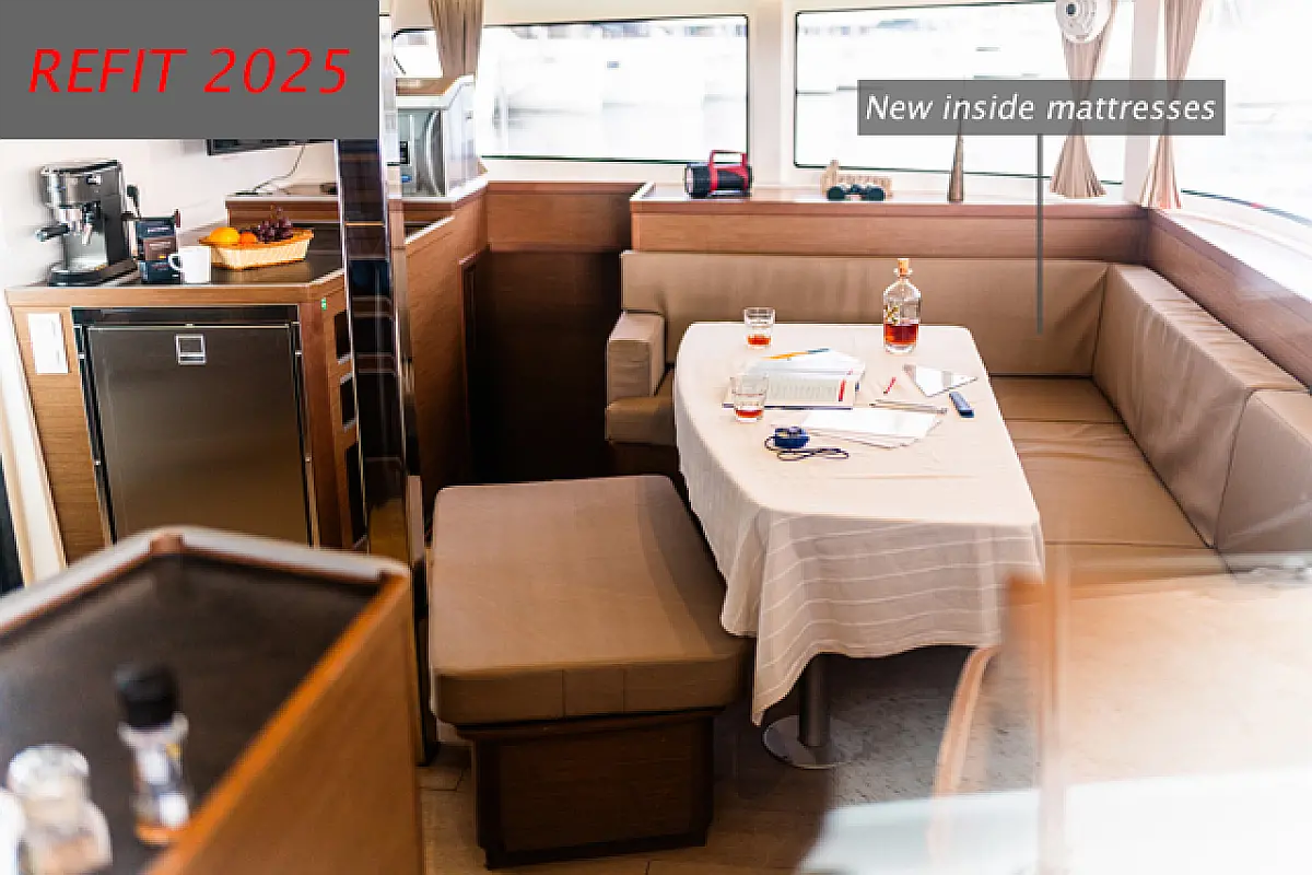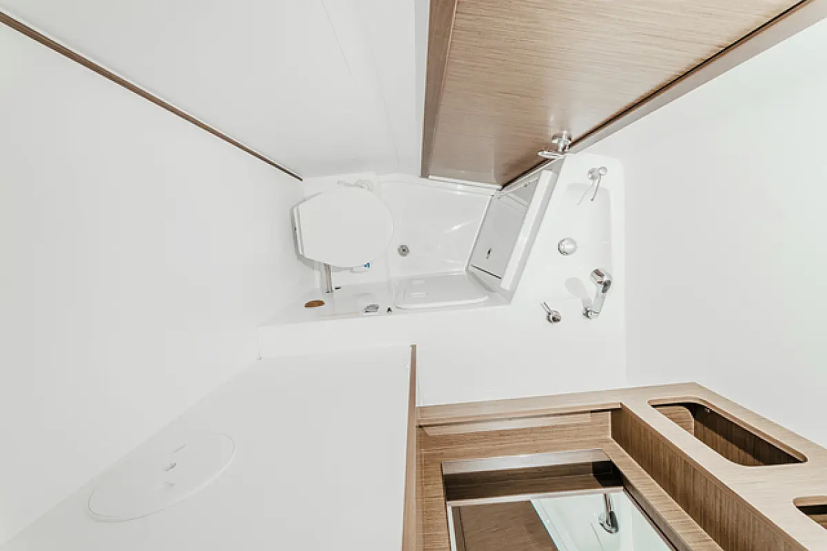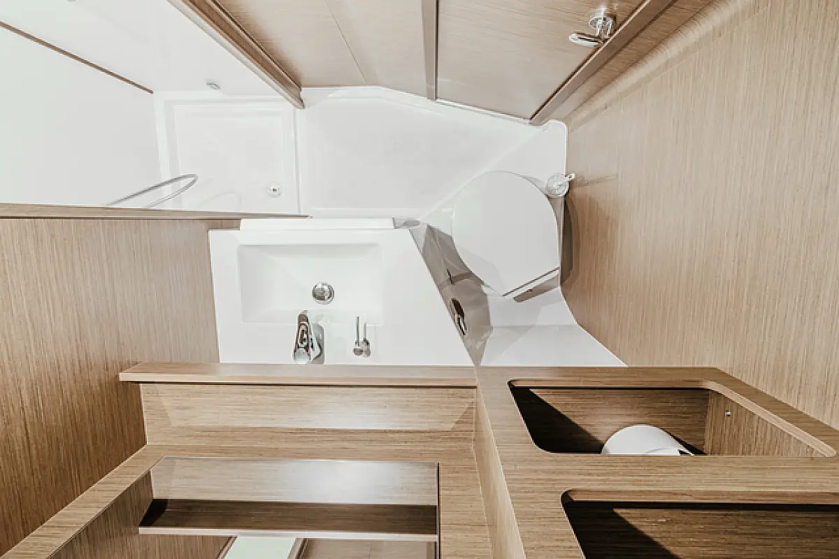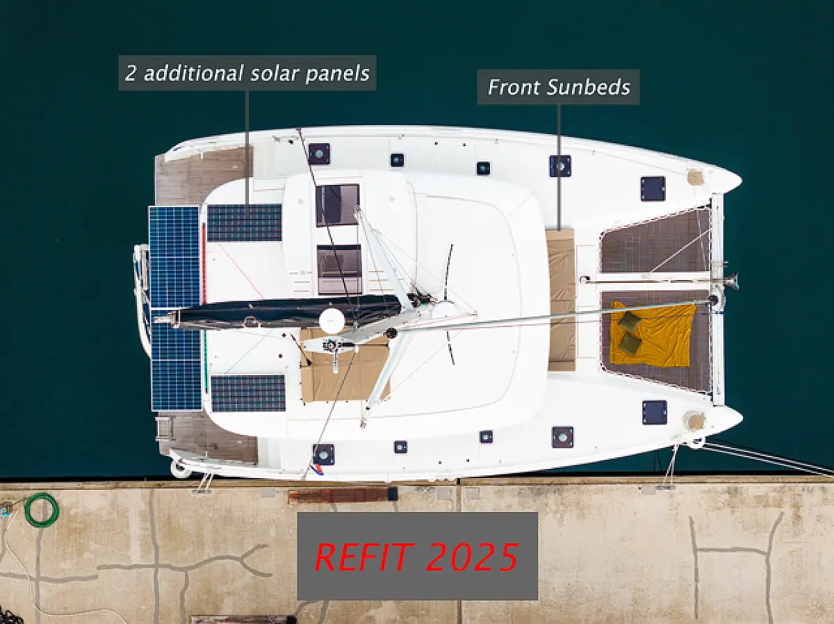 Climatisation, Machine à café, Coussins de cockpit, Annexe, Winchs électriques, Toilette électrique, Machine à glaçons, Réservoir d'eaux usées, Convertisseur, Bimini, Panneaux solaires, Capote de roof, Cockpit en teck, Chauffage