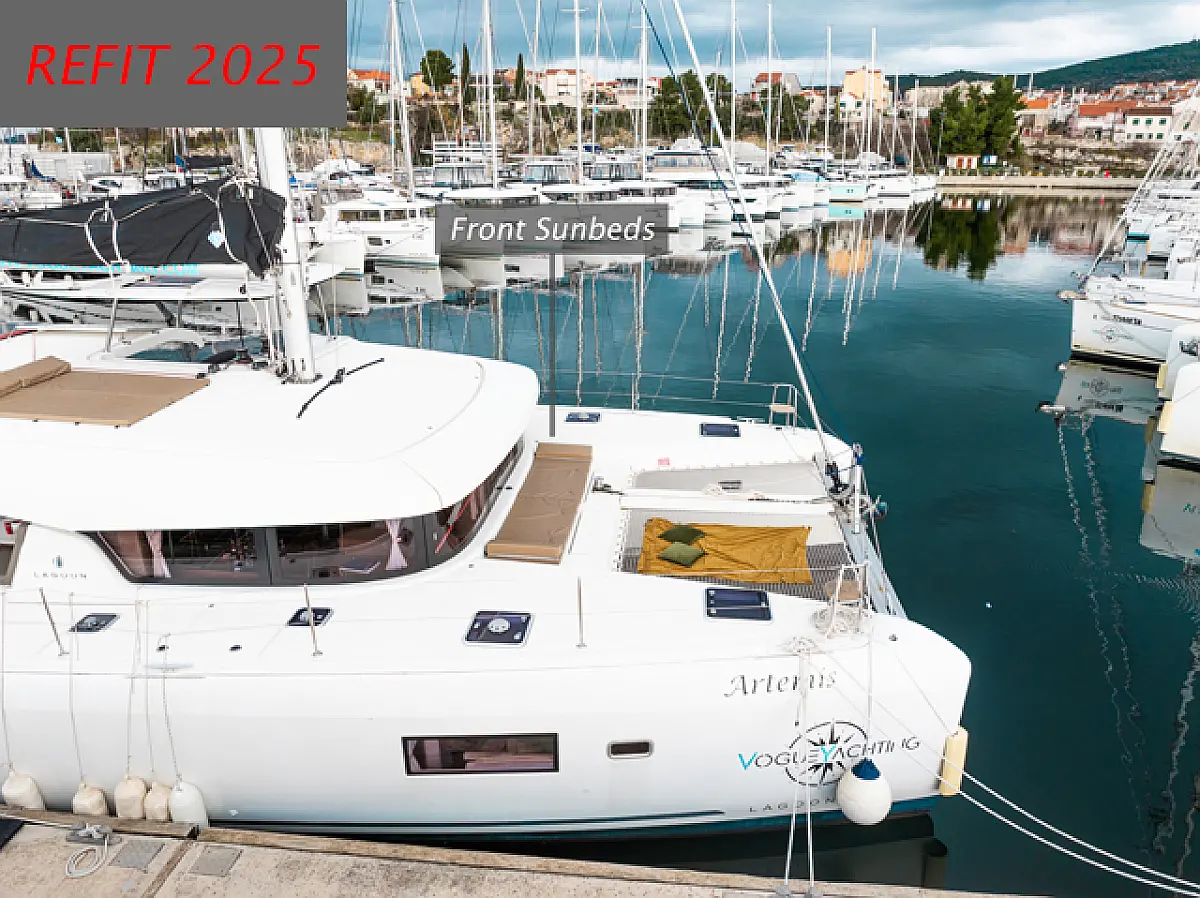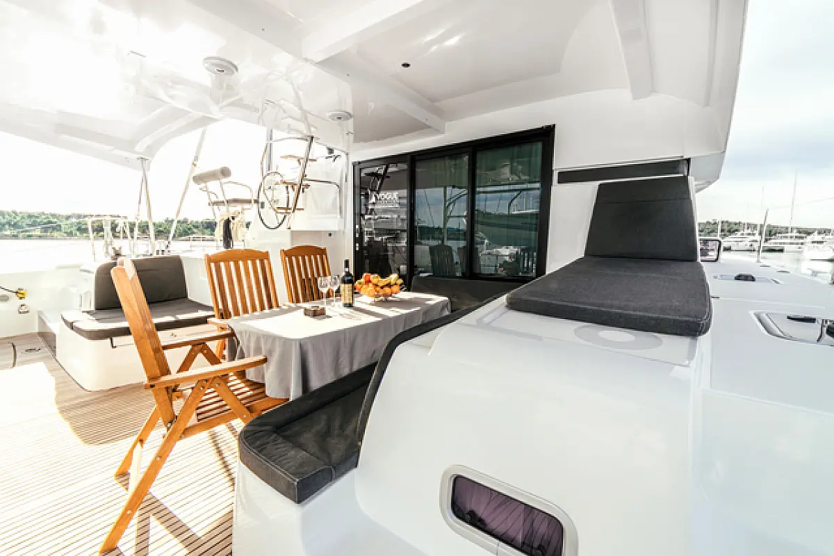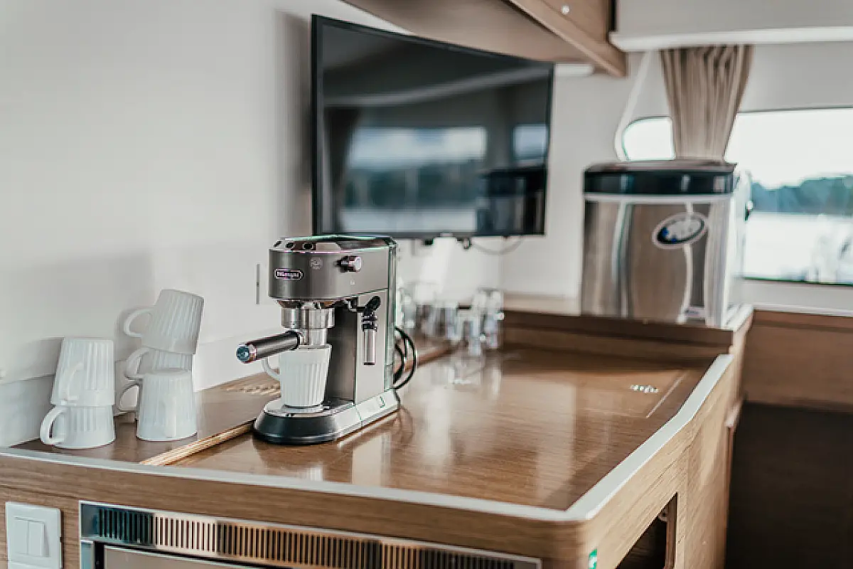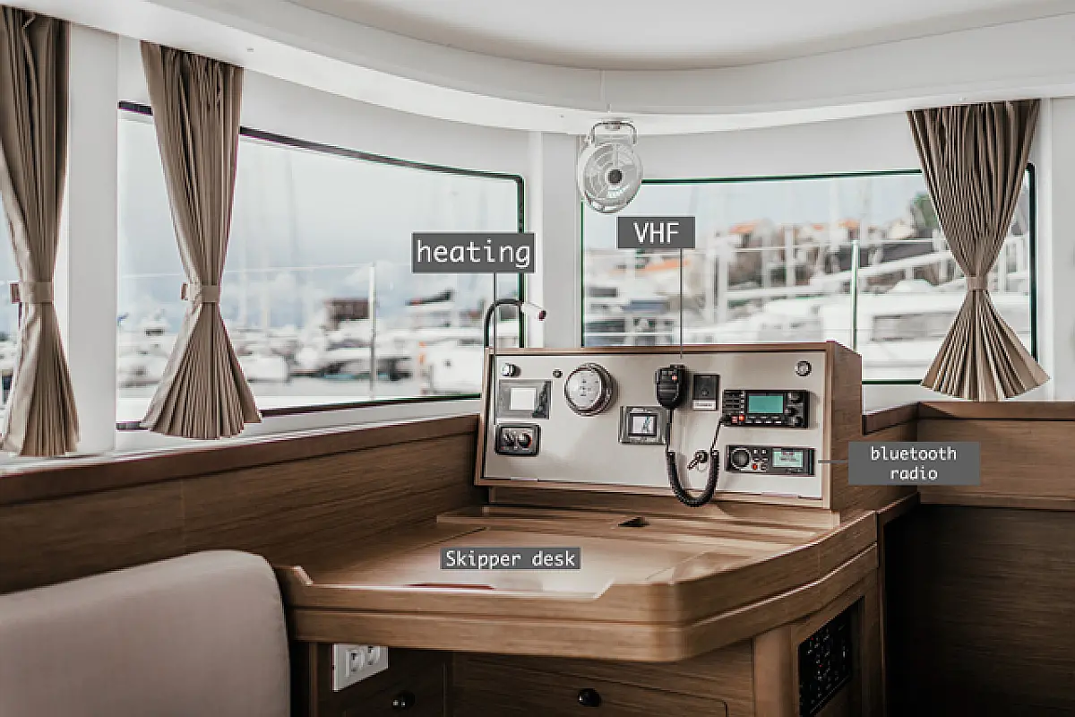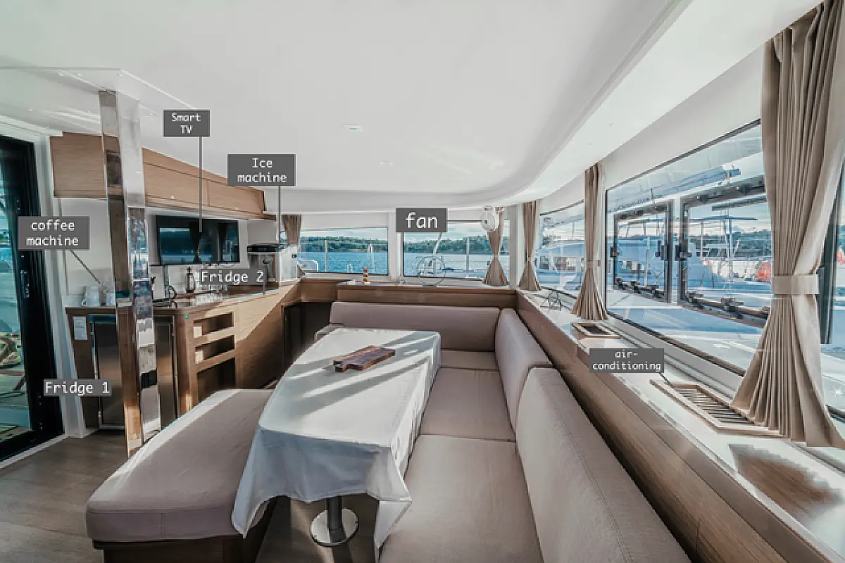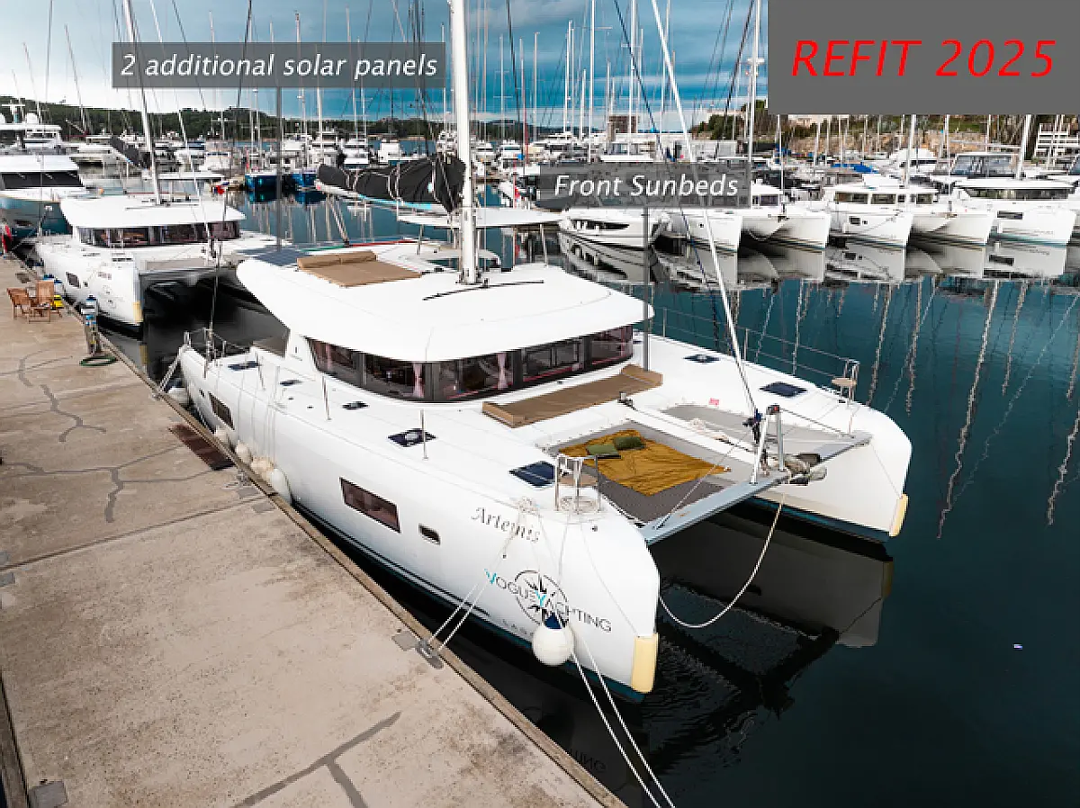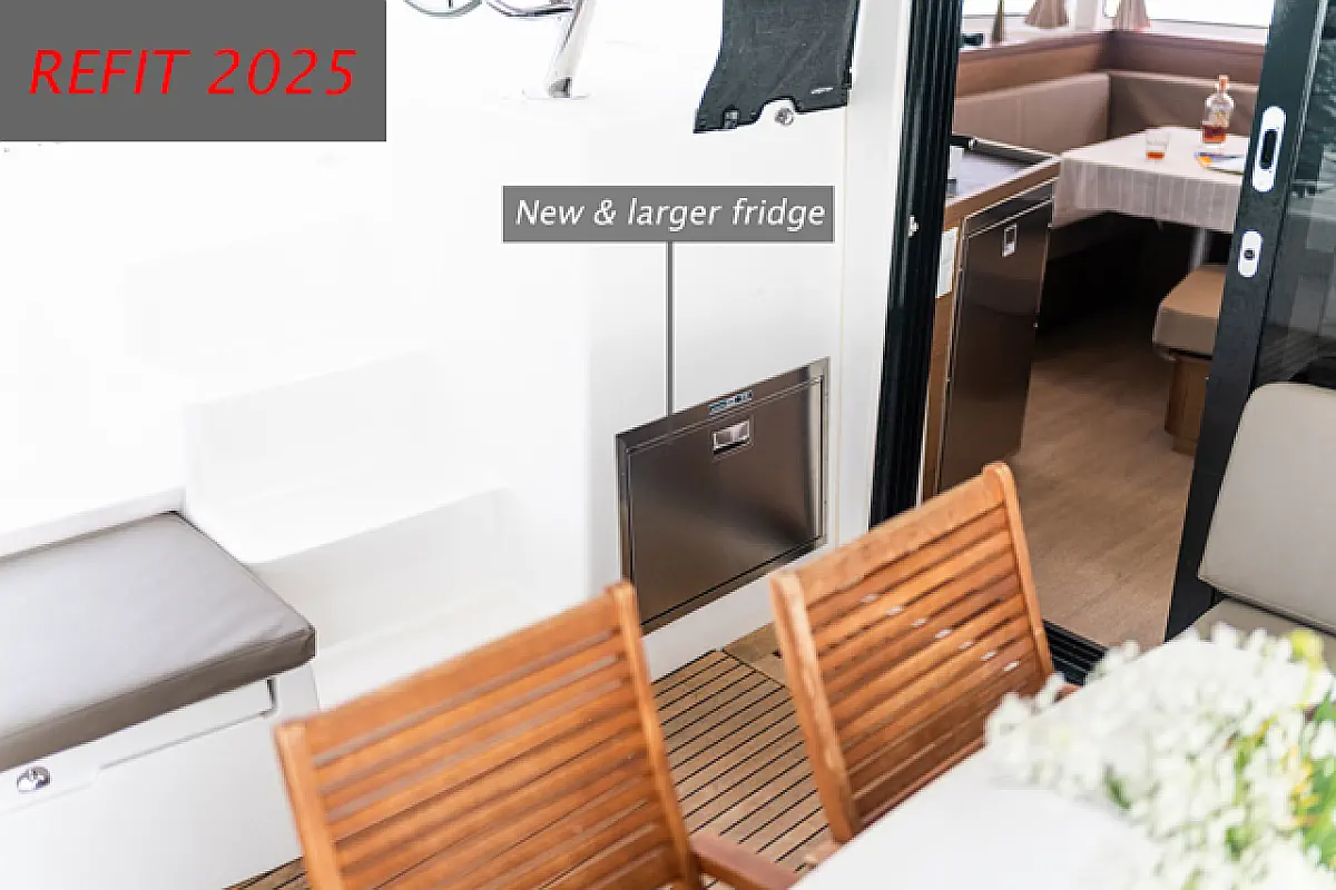 Climatisation, Machine à café, Coussins de cockpit, Annexe, Winchs électriques, Toilette électrique, Machine à glaçons, Réservoir d'eaux usées, Convertisseur, Bimini, Panneaux solaires, Capote de roof, Cockpit en teck, Chauffage