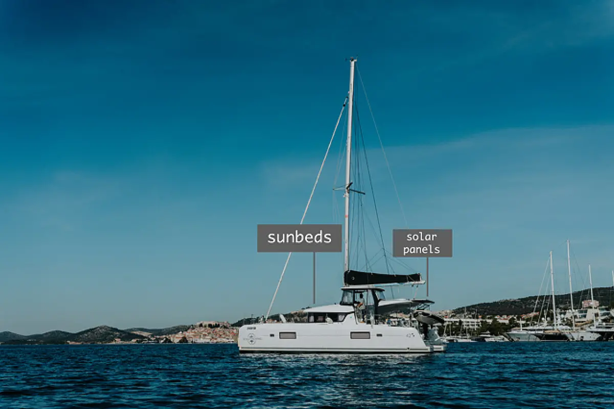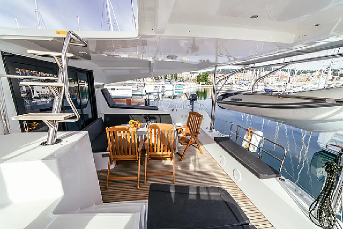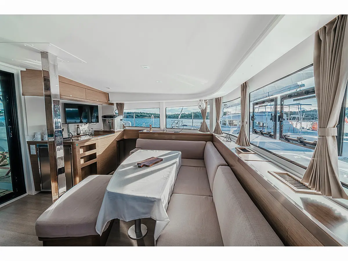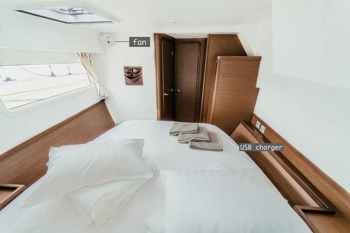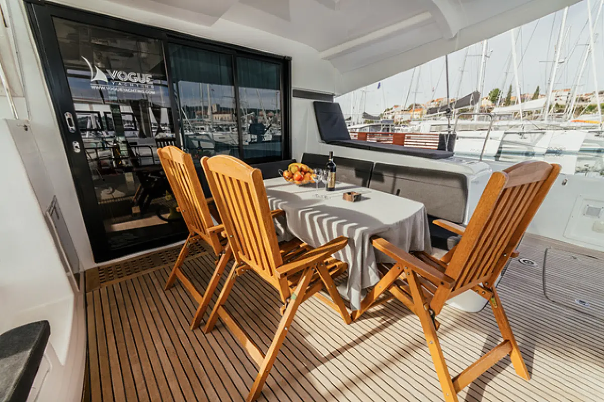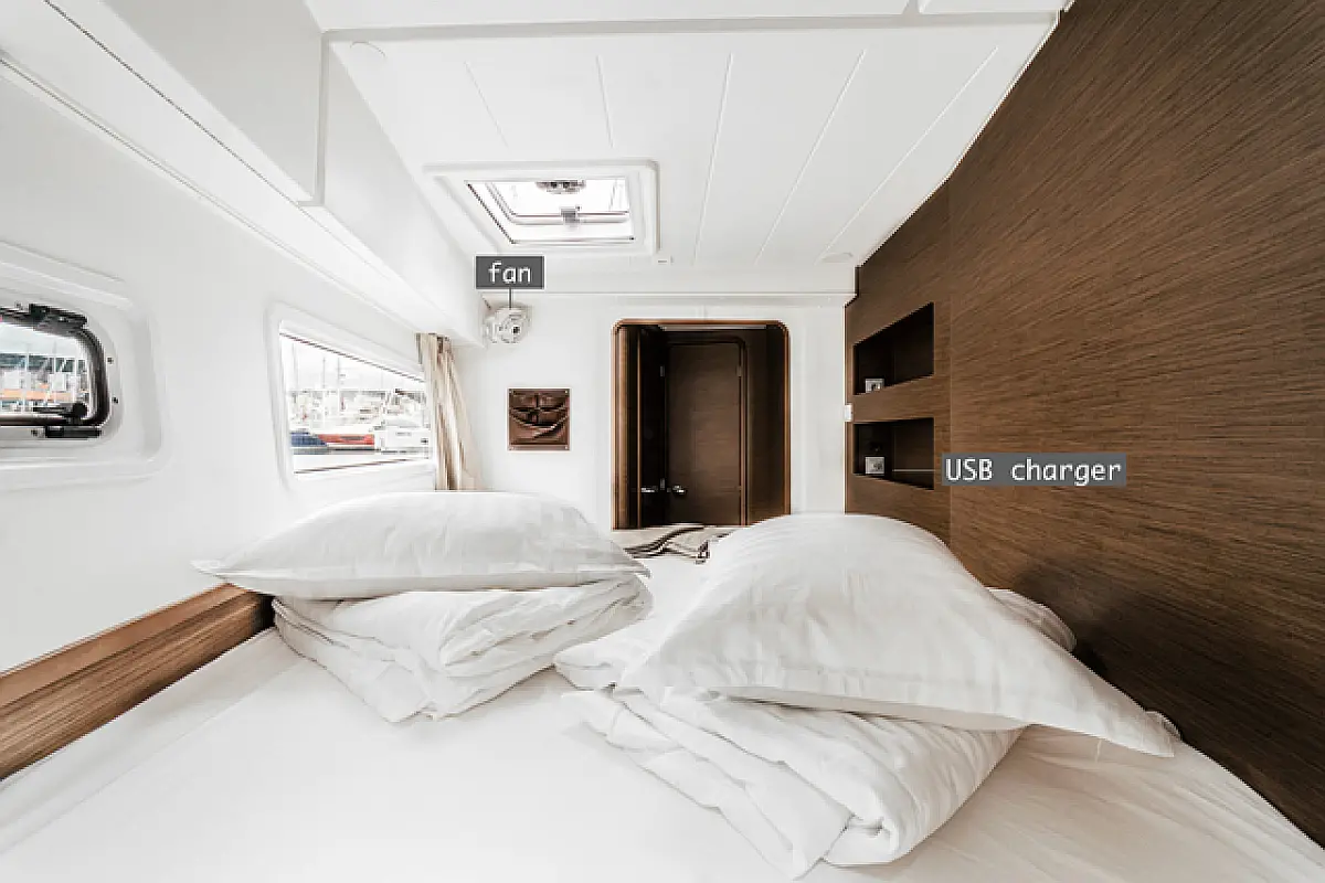 Climatisation, Machine à café, Coussins de cockpit, Annexe, Winchs électriques, Toilette électrique, Machine à glaçons, Réservoir d'eaux usées, Convertisseur, Bimini, Panneaux solaires, Capote de roof, Cockpit en teck, Chauffage