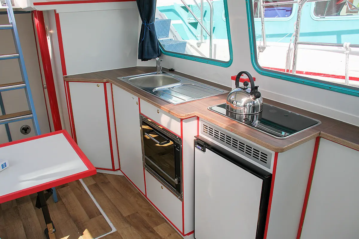 Plate-forme de baignade, Bimini, Réfrigérateur, Chauffage, Toilette électrique, Panneaux solaires