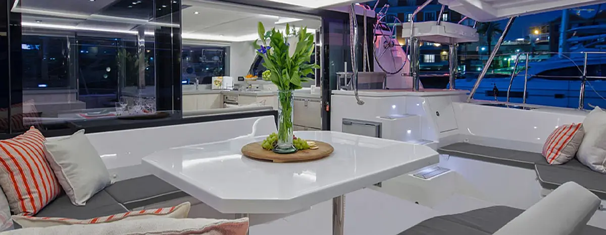 Réfrigérateur, Bimini, Climatisation, Enceinte dans le cokpit, Coussins de cockpit, Générateur, Panneaux solaires, Toilette électrique, Dessalinisateur